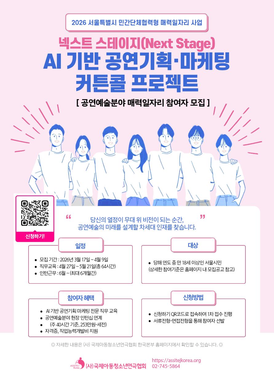 2026 민간단체협력형 서울시 매력일자리 사업 「 넥스트 스테이지 : AI기반 공연기획․마케팅 커튼콜 프로젝트 」 참여자 모집 공고 2026 민간단체협력형 서울시 매력일자리 사업-넥스트 스테이지 : AI기반 공연기획․마케팅 커튼콜 프로젝트 참여자참여자 모집을 아래와 같이 공고합니다. 2026. 3. 17. (사)국제아동청소년연극협회 한국본부 - 아 래 - 1. 사업명 : 넥스트 스테이지 : AI기반 공연기획․마케팅 커튼콜 프로젝트 2. 공고기간 : 2026. 03. 17.(화) ~ 04. 09.(금) 3. 접수기간 : 2026. 03. 17.(화) ~ 04. 09.(금)(24일간) 4. 모집인원 : 17명 5. 신청서류 접수처 : assitejkorea2026@gmail.com (메일 접수만 가능) 6. 신청자격 ※ 모집(채용)공고일 기준(’26.3.17.) 자격요건을 충족하고 배제사유가 없어야 하며, 모집(채용) 공고일 기준 자격요건은 사업 참여 종료시까지 유지되어야 함 가. 당해 연도 중 만 18세 이상인 서울시민으로서 다음 참여요건을 모두 갖추고 사업 참여배제 사유가 없는 자 나. 사업 참여배제자 ① 서울시민이 아닌 자 ② 만 18세 미만자 ③ 공고마감일 현재 취업상태인자 ④ 서울 매력일자리 사업 참여 경력이 총합 18개월을 초과한 자(다만, ‘16년 까지 참여경력은 합산하지 아니함) ⑤ 대학 또는 대학원에 재학 중인 자(휴학생 포함) ‣ 단, 대학교(원) 수료생, 졸업예정자, 졸업유예자, 방송통신대학‧사이버대학․야간대학(원) 재 학생은 참여가능 ※ 졸업예정자는 대학에서 ‘졸업예정증명서’를 발급받아 제출/휴학생은 참여불가 ⑥ 아동․청소년 관련 사업의 경우「아동·청소년의 성보호에 관한 법률」,「아동복지법」등에서 정한 범죄경력이 있는 자 ⑦ 노인 관련 사업의 경우 「노인복지법」등에서 정한 범죄경력이 있는 자 ⑧ 신청서, 정보제공 동의서 등 신청 구비서류를 제출하지 않은 자 ⑨ 기타 지병․건강쇠약 등으로 근로가 불가하다고 판단되는 자 ⑩ 서울시에 주민등록 등재가 되어 있지 않은 외국인 ⑪사업자등록증이 있는 자, 다만, 사업자등록을 한 경우라도 휴업신고를 하는 등 실제 사업을 하지 아니하였음을 증명한 경우와 부동산임대업 중 근로자를 고용 하지 아니하고 임대사무실도 두지 아니한 경우임을 증명한 경우 참여가능